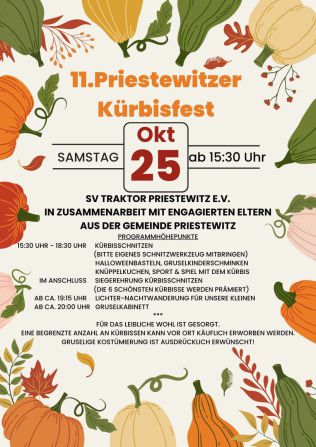 Am Samstag, 25.10.2025 findet unser 11. Kürbisfest in Priestewitz statt. Kommt vorbei!